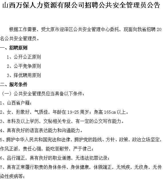 根據(jù)工作需要,經(jīng)市政府批準,現(xiàn)面向社會招聘60名(男35人,女25人)警務(wù)輔助人員,派遣至太原市公...